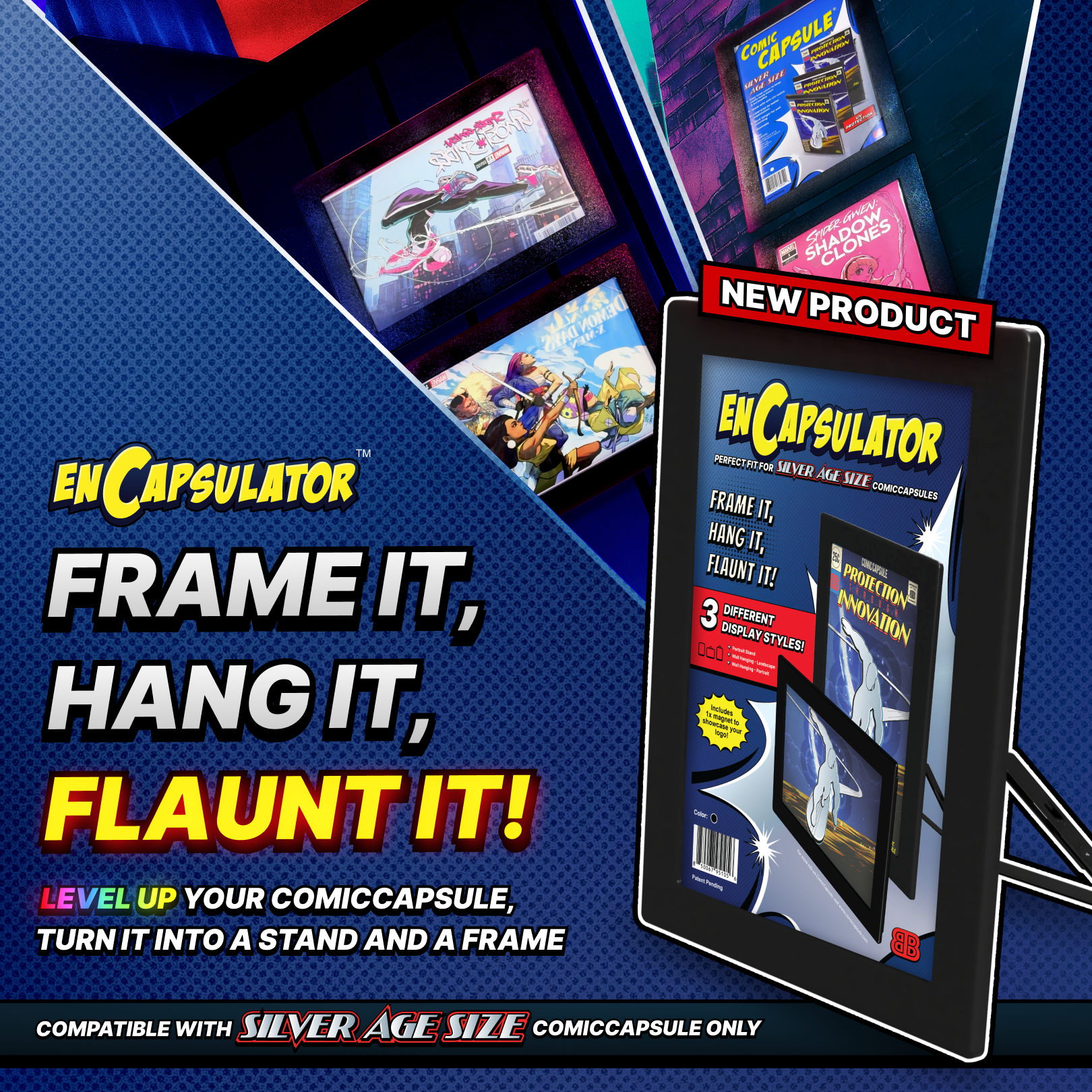 The Encapsulator is the ultimate add-on frame designed to level up your ComicCapsule experience. Crafted specifically for Silver Age ComicCapsules (for now), it instantly transforms your storage case into a sleek tabletop display, upright shelf piece, or wall-mounted art.