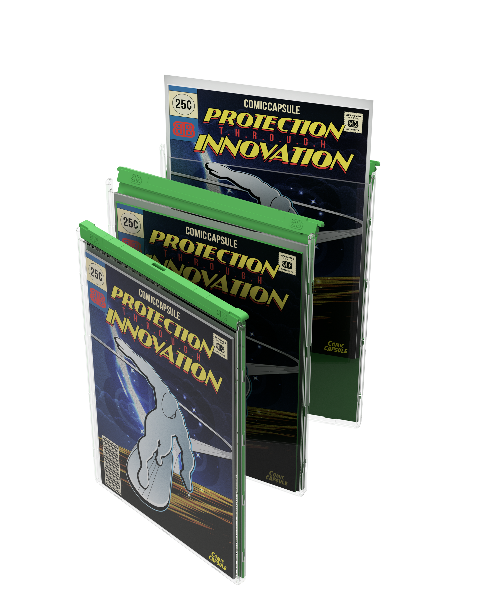 Our top-tier ComicCapsule, now with Silver Age Size, the premier comic book protector designed to safeguard your prized collection with unparalleled precision. Crafted meticulously for durability, our ComicCapsule offers an impenetrable defense against dust, UV, and wear, ensuring your comics remain in pristine condition whether you choose to display or store your comics.